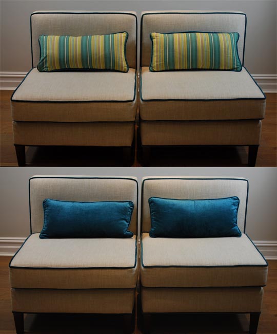 A plain sofa may magically become a focal point, if you decorate it with unusual or exotic cushions." (Interior Designer)