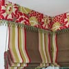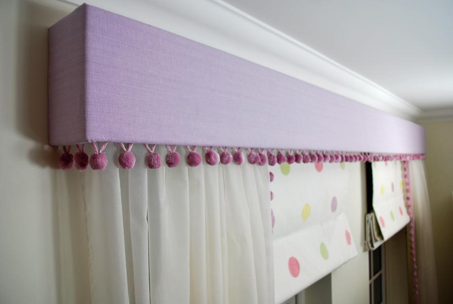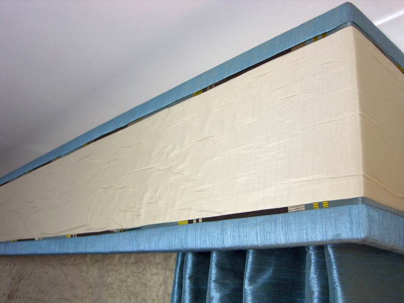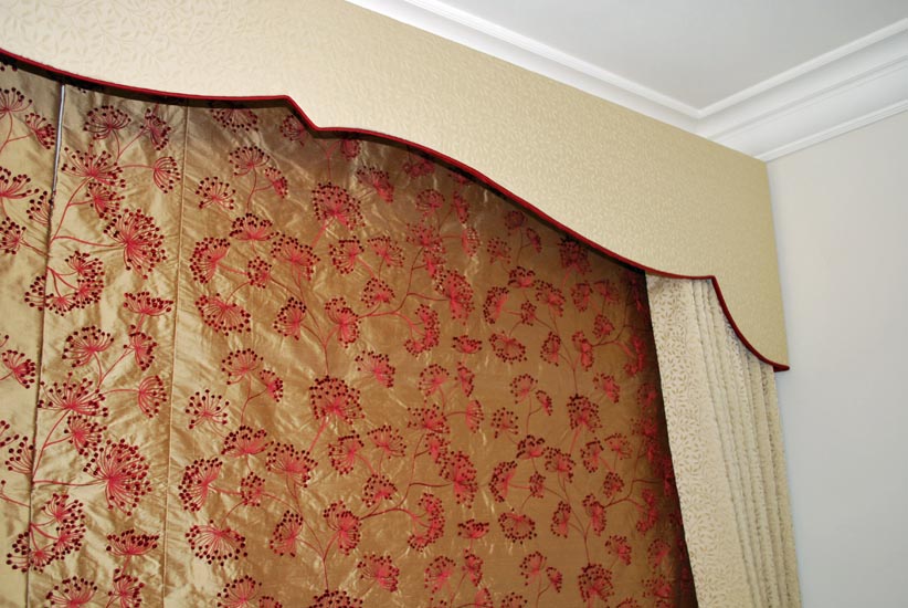 As a part of a complete window treatment job we make upholstered pelmets, shaped, straight or piped, pelmets for bay windows or oval windows.